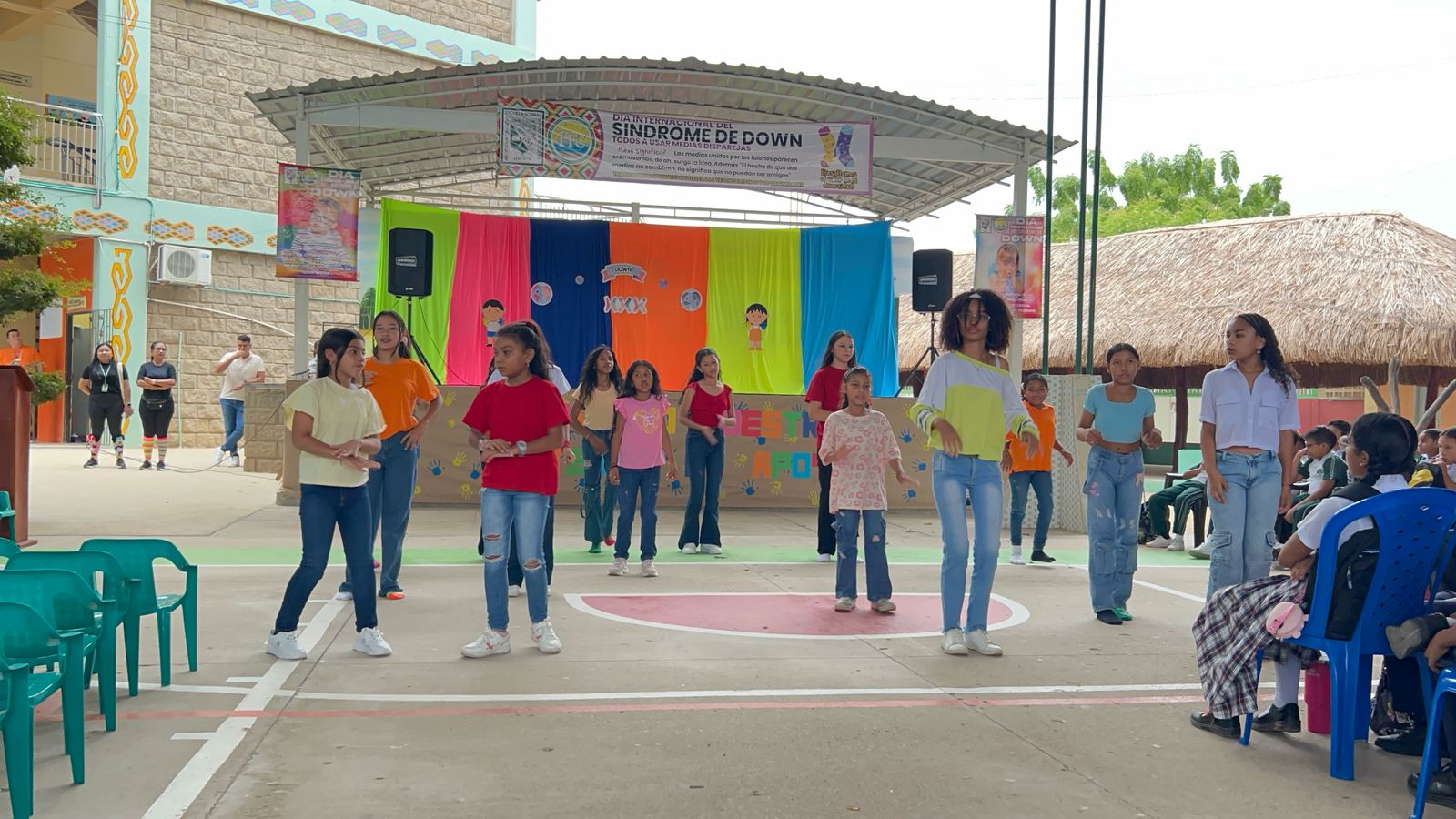 Para concluir la jornada con un ambiente festivo, un grupo de estudiantes deleitó a la audiencia con una presentación de baile en honor a los homenajeados, promoviendo la integración y el reconocimiento de valores esenciales.